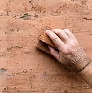 Il segreto della sagramatura ferrarese non sta solo nel secchio, ma nel braccio. Dopo aver bagnato il muro “a rifiuto”, si stende un velo sottile di impasto e, mentre è ancora fresco, si interviene con un mattone a pasta molle o un frattazzo di spugna, sfregando con movimenti circolari.